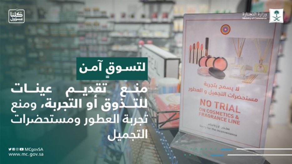 وزارة التجارة On Twitter لتسوق آمن منع تقديم عينات للتذوق أو التجربة ومنع تجربة العطور ومستحضرات التجميل كلنا مسؤول
