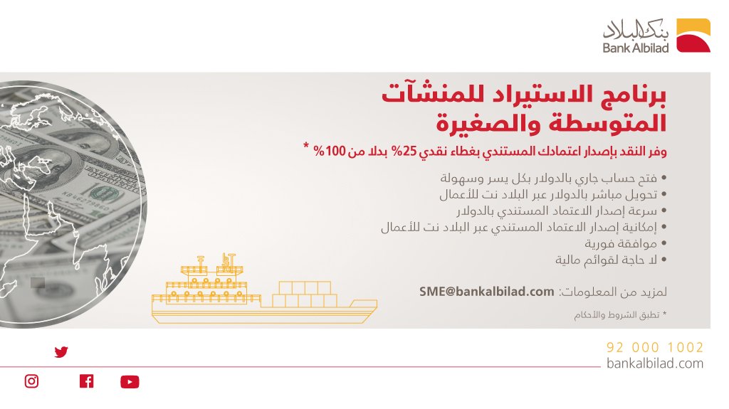 بنك البلاد Bank Albilad على تويتر برنامج الاستيراد للمنشآت المتوسطة والصغيرة وفر النقد بإصدار اعتمادك المستندي بغطاء نقدي 25 بدلا من 100 Https T Co Uzmjmvrvz4 Https T Co J2pu7xdkxl