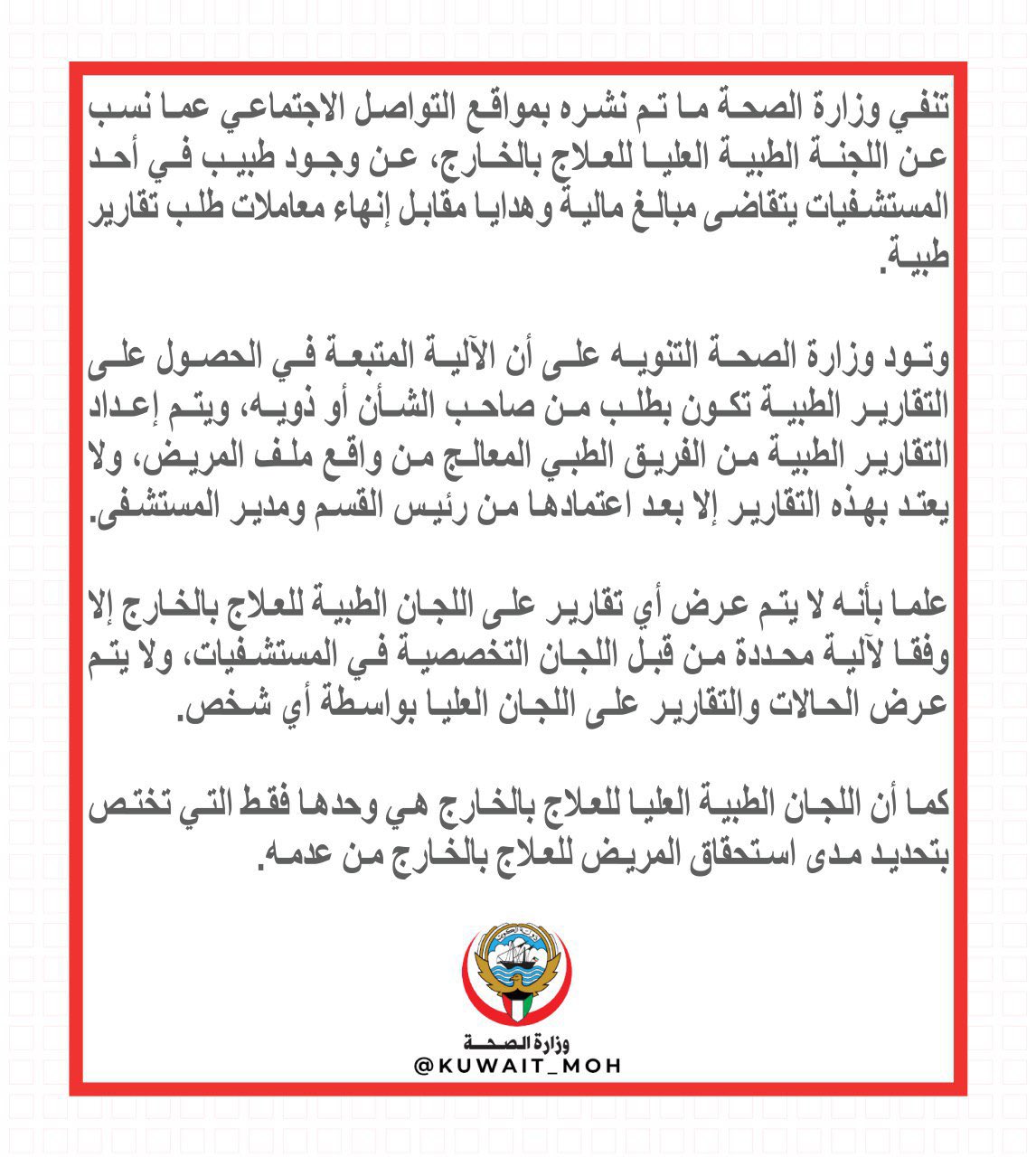 خدمة الوصفة الطبية الإلكترونية. التقارير الطبية باللغة العربية وأي تقارير تتعلق بالإجازات المرضية يتم اصدارها بخطاب من جهة حكومية رسمية. سكاي برس أعلنت وزارة الصحة الاحد اصدراها أمرا وزاريا بتوزيع الملاكات المشمولة بقانون التدرج الطبي. خدمة التقارير الطبية.