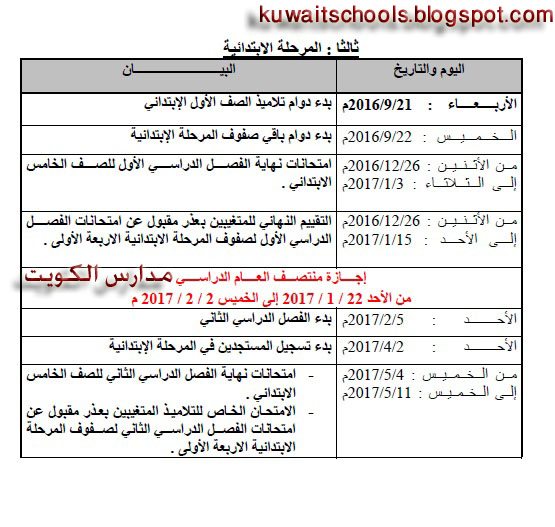 مدارس الكويت التقويم الدراسي للعام 2016 2017