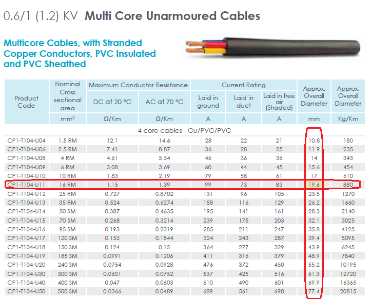 جدول مساحة مقطع الكابلات واقصى شدة تيار تتحملها
