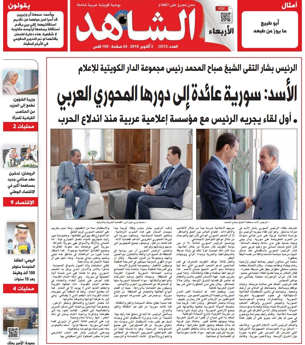 شامل نيوز בטוויטר الشيخ صباح المحمد رئيس تحرير جريدة الشاهد يخرج عن السياسة الرسمية الكويتية ويقابل الرئيس السوري بشار الأسد ويكيل له المدائح تاركا استفهامات عن دوافع الزيارة وتناسي حمامات الدماء