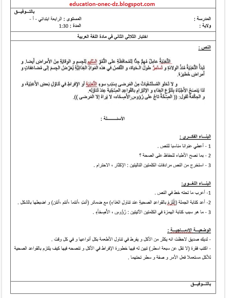الامتحان رقم 2 للثلاثي الثاني لغة عربية للسنة الرابعة ابتدائي الجيل الثاني