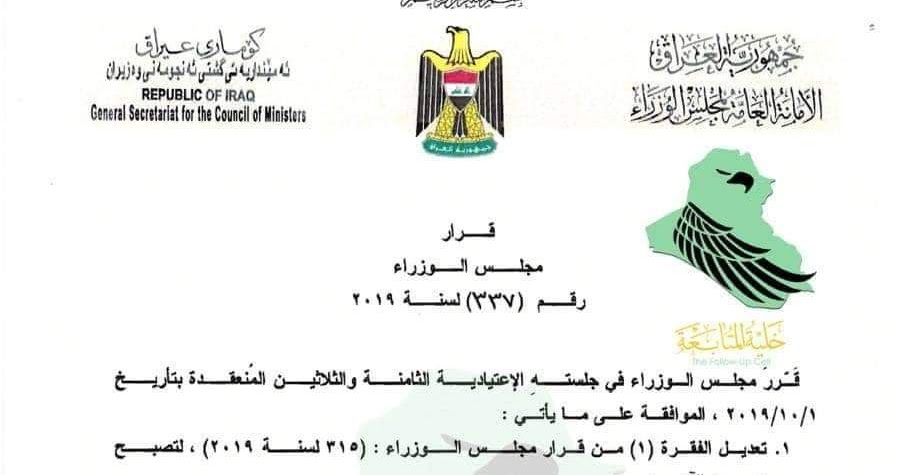 تعليمات قرار ٣١٥ وقرار ٣٣٧ ادناه قرار ٣٣٧ والذي فيه تعديل لقرار ٣١٥ في فقرة شمول من لديه خدمة اقل من سنة تعيينات وظائف العراق
