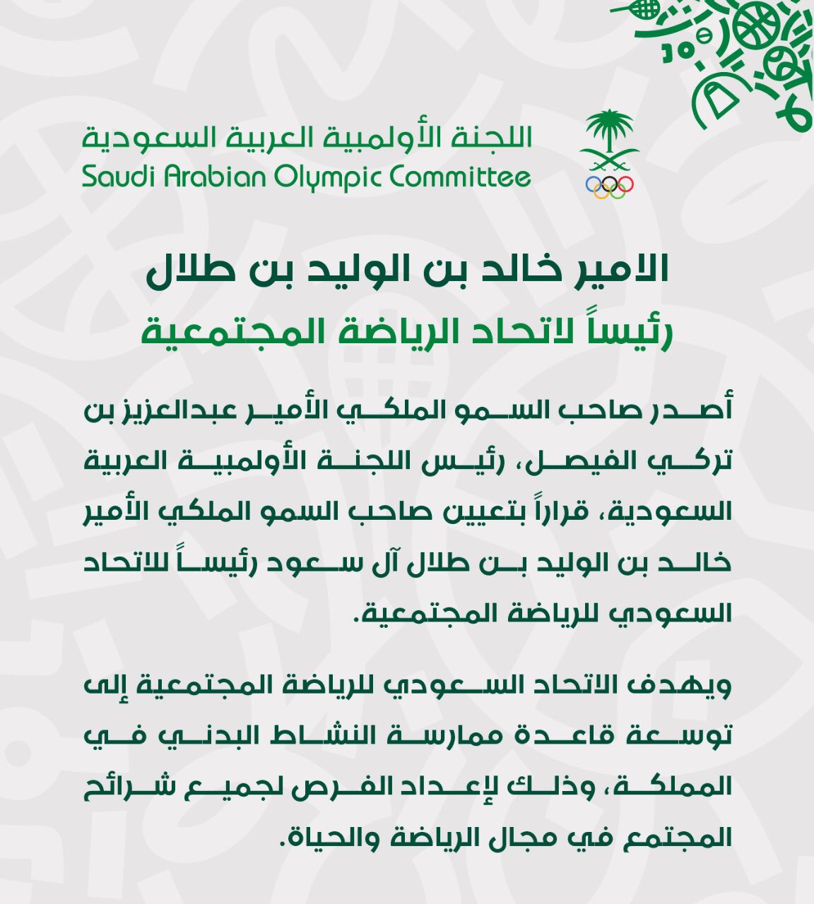 Saudi Olympic الأولمبية السعودية On Twitter سمو رئيس اللجنة الأولمبية العربية السعودية الأمير عبدالعزيز بن تركي الفيصل ي صدر قرارا يقضي بتعيين الأمير خالد بن الوليد بن طلال رئيسا للاتحاد السعودي للرياضة
