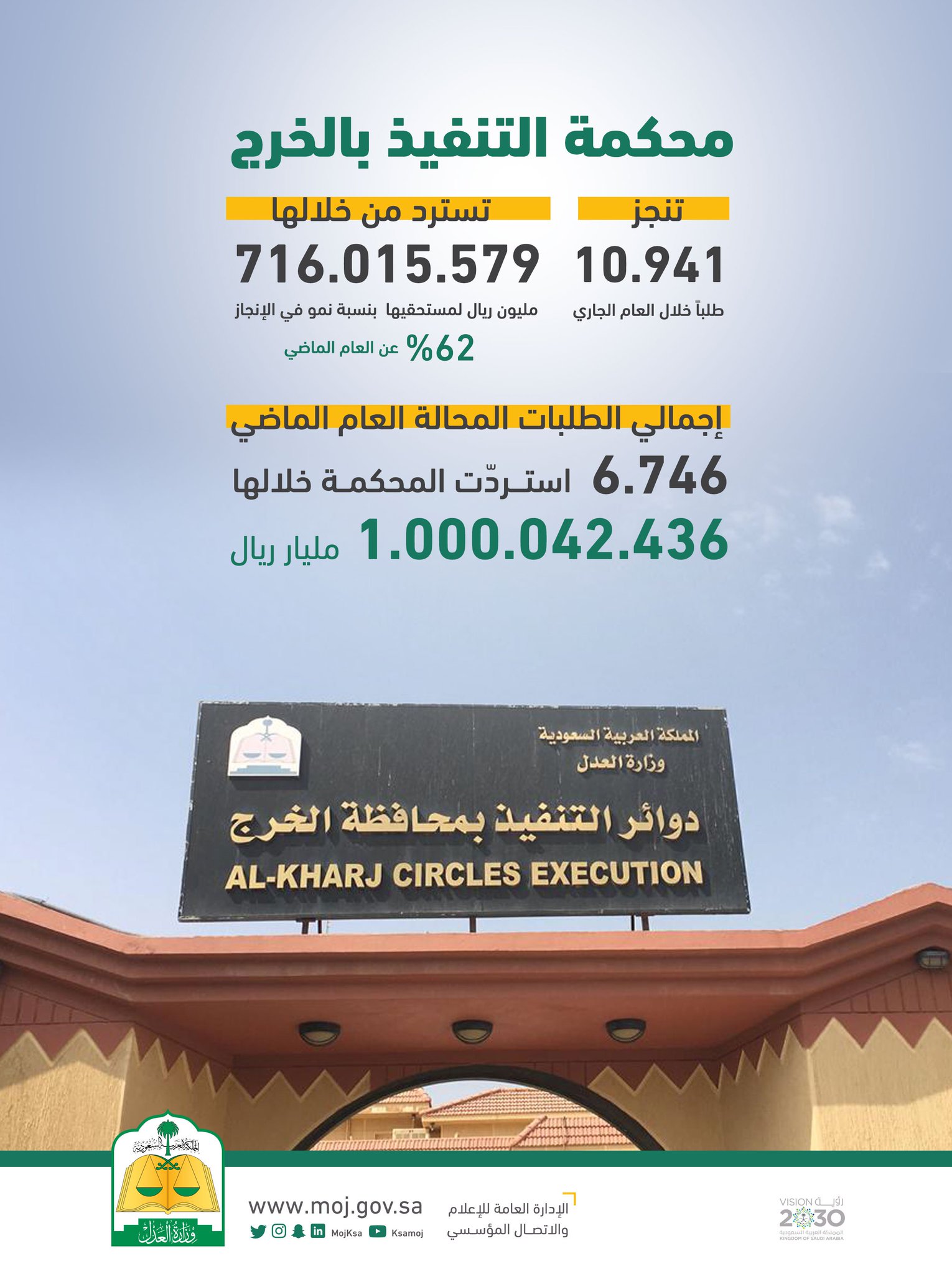 وزارة العدل على تويتر أرقام عدلية L محكمة التنفيذ بالخرج تسترد أكثر من 716 مليون ريال لمستحقيها بنسبة إنجاز 62 عن العام الماضي