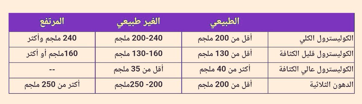د عبدالعزيز العجاجي On Twitter معدلات الكوليسترول الطبيعية ارتفاعه لا يسبب أية أعراض ظاهرة والطريقة الوحيدة للتشخيص هي عمل تحليل الدهون في الدم