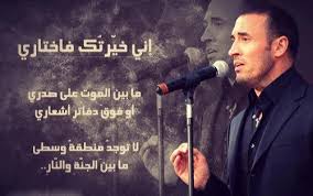 إختاري إني خيرتك فاختاري ما بين الموت على صدري أو فوق دفاتر أشعاري إختاري الحب أو اللاحب فجبن ألا تختاري لا توجد منطقة وسطى ما بين الجنة والنار إرمي أوراقك كاملة وسأرضى