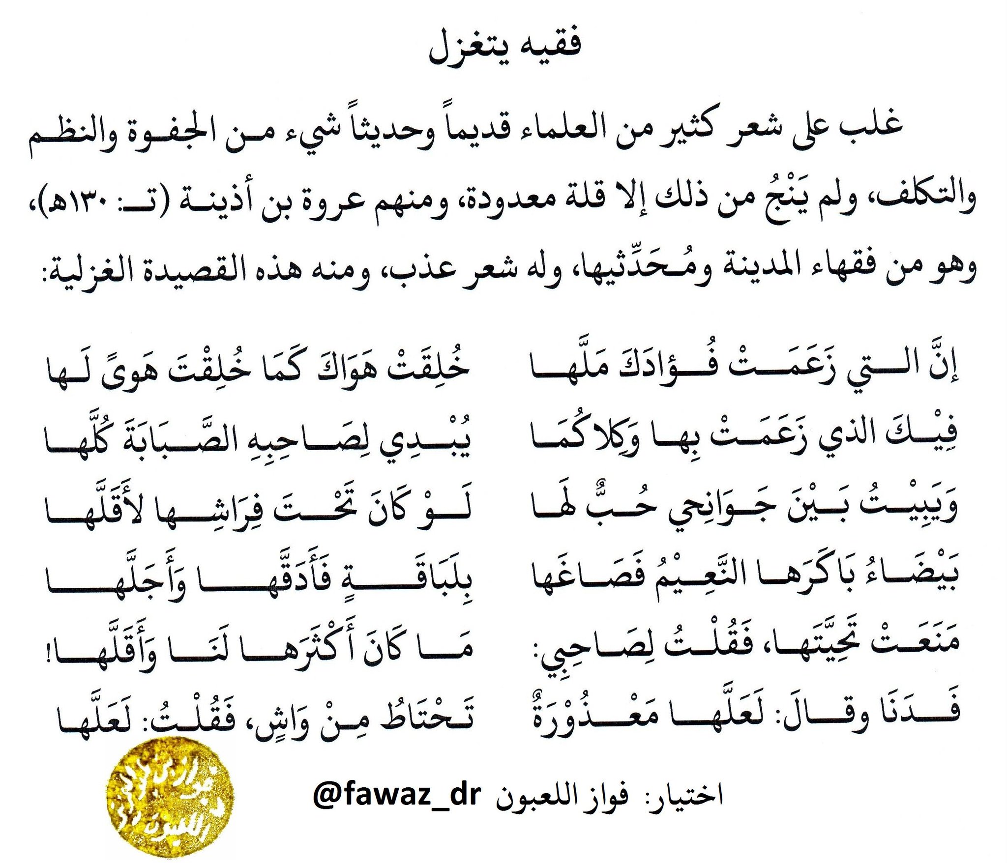 علي بن يوسف الربيعان On Twitter عروة بن أذينة كتب قصيدة غزلية مامر على تاريخ البشرية عمق مثلها مطلعها للي بيقراها إن التي زعمت فؤادك مل ها خلقت هواك كما خلقت