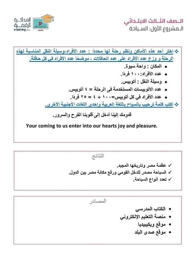 ننشر نموذجا استرشاديا لمشروع البحث لطلاب الصف الثالث الابتدائي عن السياحة الجمهورية أون لاين