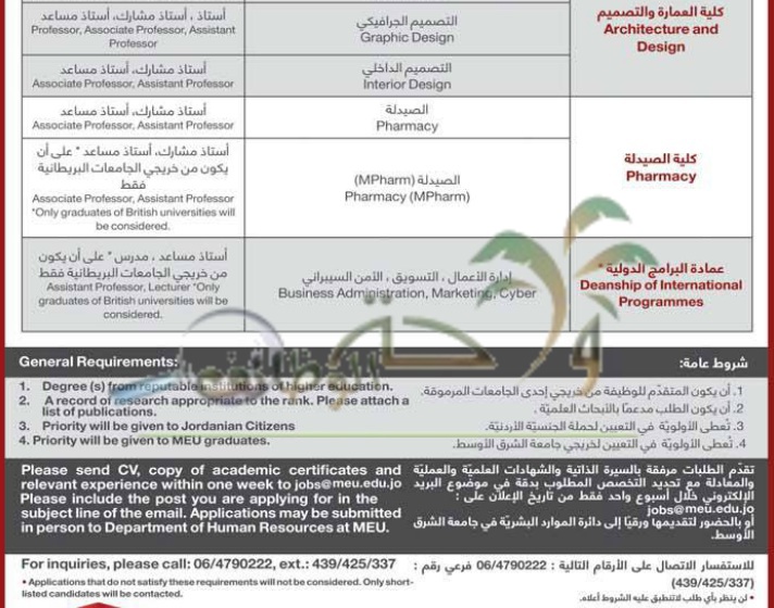 تعلن جامعة الشرق الأوسط عن توفر فرص عمل لديها في الوظائف التالية وظائف في الاردن والخليج